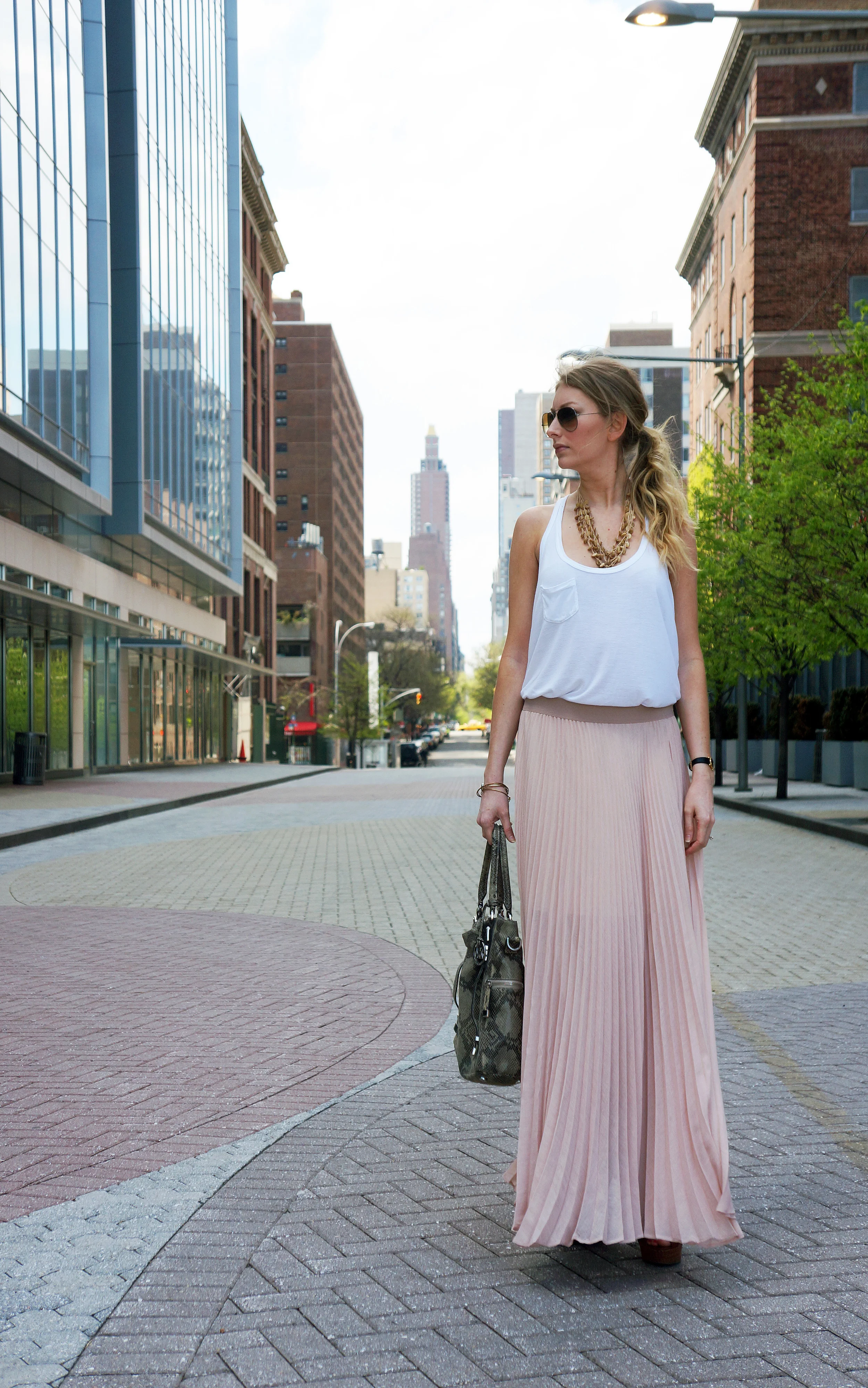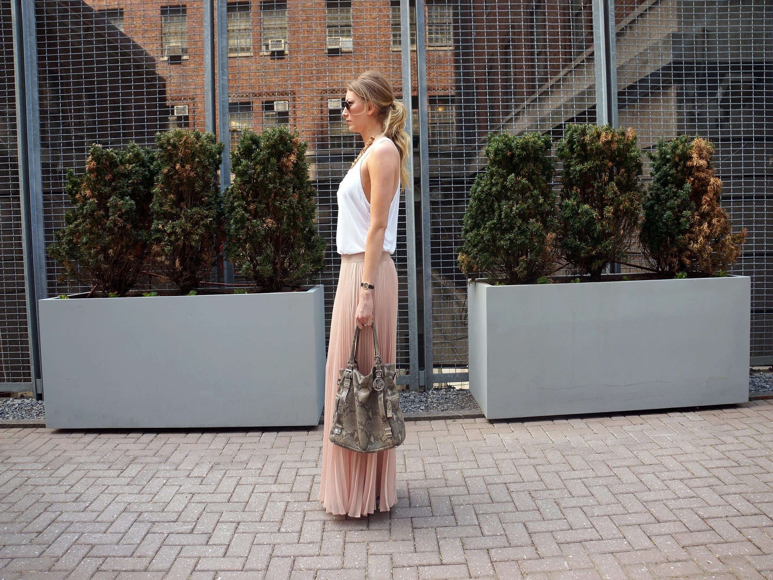 I love maxi skirts. There's just something about wearing one and having the breeze lightly dance with it. They're great to wear at the beginning of summer when it's not brutally hot outside. I paired this BCBG maxi skirt with a Michael Stars swing tank, a great pair of platform heels (the last thing you want is your beautiful maxi skirt to drag the ground), and a wooden beaded necklace I bought from a local last year in Saint Lucia. I finished the look with a messy, beachy, low ponytail and grabbed my Michael Kors snakeprint bag.